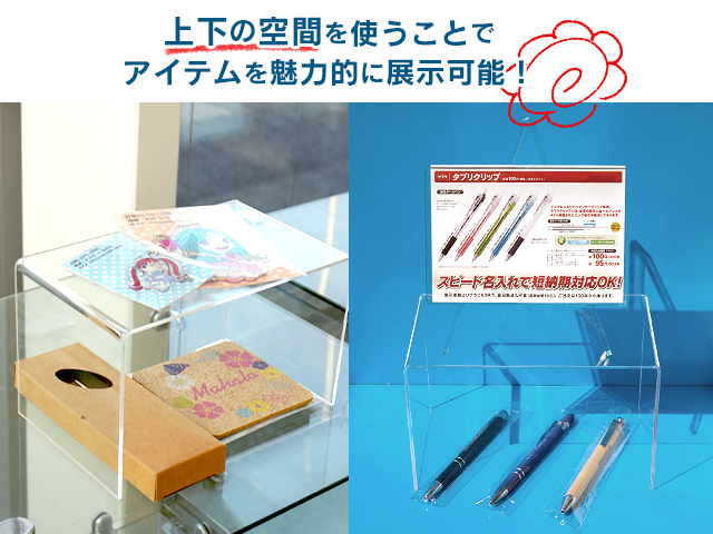 アクリル製のディスプレイ用品で、商品を立体的に陳列することができる商品です。独自の製造技術で業界の中でもかなり最安な価格でのご提供が可能です。アクセサリーや小物・キャラクターフィギュアなども展示が出来るので、小売店やセレクトショップ・雑貨店など幅広い場所でお使いいただけます。